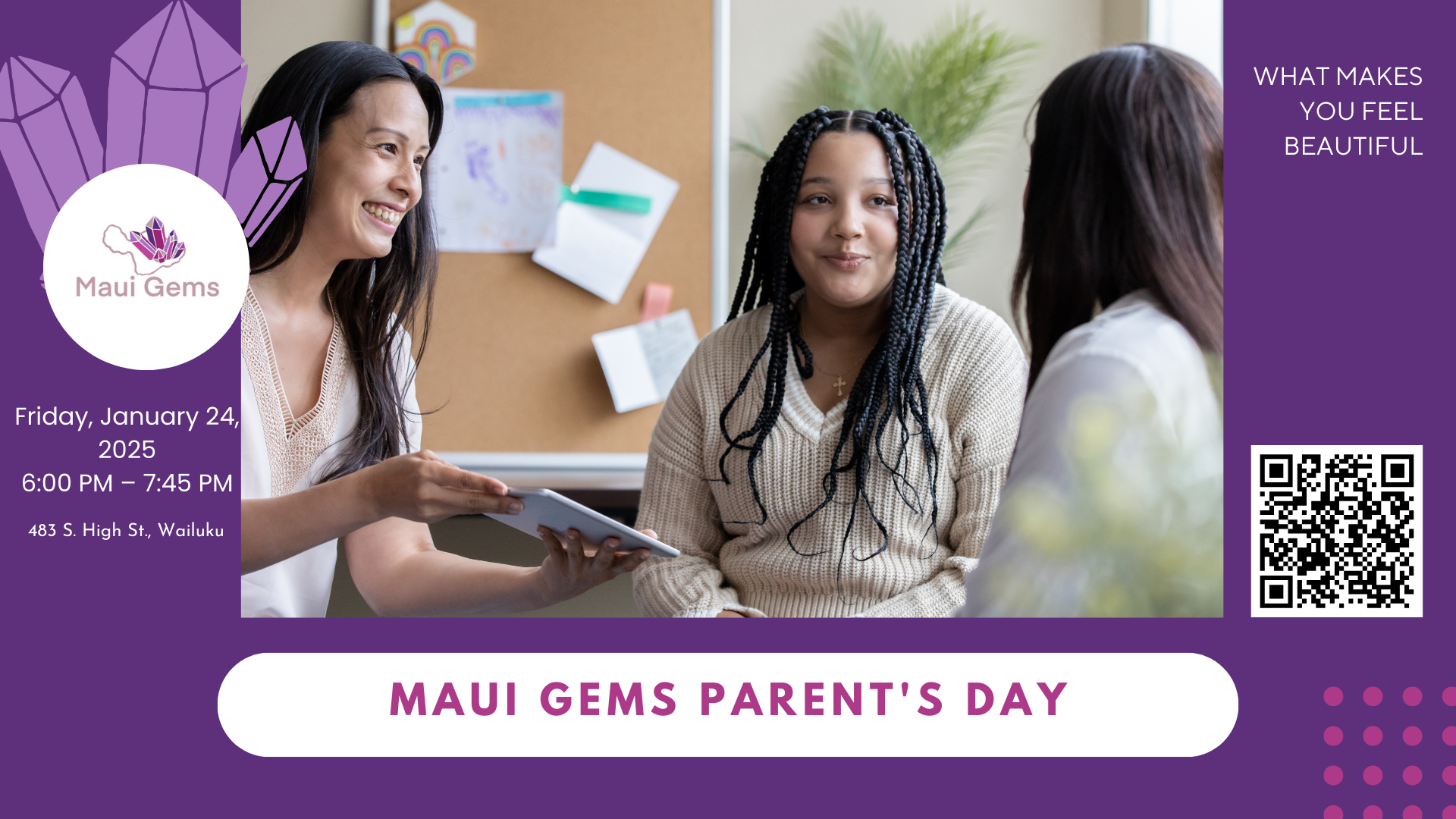 We are gearing up for an exciting Parent’s Day with MAUI GEMS event on Friday, January 24, 2025, and we’d love your support to make it a memorable experience for families, mentors, and youth.