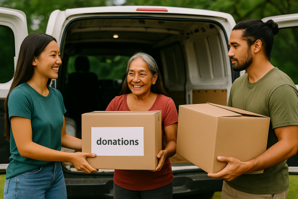 Strong hands and big hearts needed. Remove products off truck and put on tables